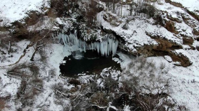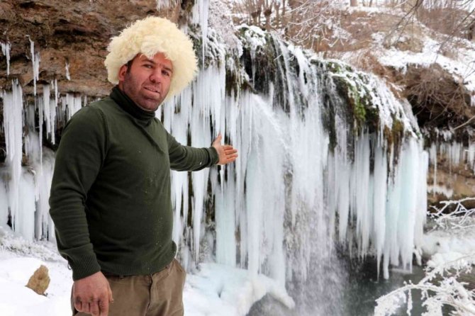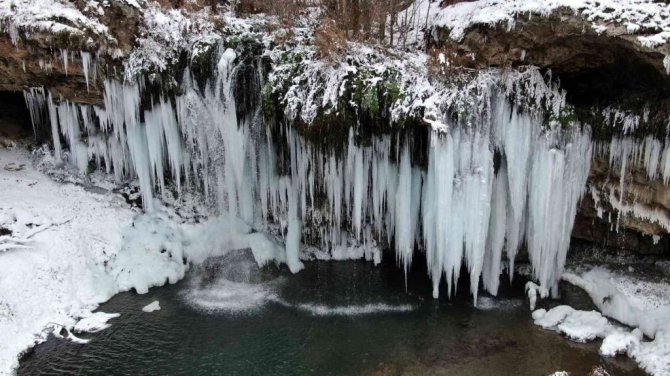 Buz tutan şelalede metrelerce sarkıtlar oluştu