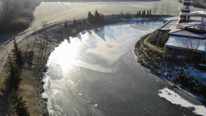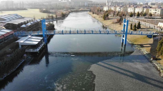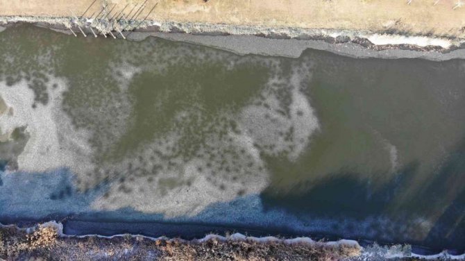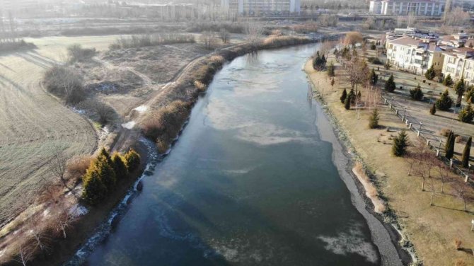 Buzla kaplanan Porsuk Çayı havadan görüntülendi
