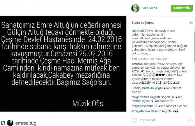 Sabah karşı hayatını kaybeden şarkıcı Emre Altuğ’un annesi Gülçin Altuğ’un ölümü, Altuğ’un eski eşi Çağla Şikel’i de üzüntüye boğdu. Anne Altuğ’un ölüm haberini Instagram hesabından paylaşan Şikel, "Nasil da seviyorduk birbirimizi rabbim sahit! Seni tatlı, naif, süslü kadınım, yavrularımın babaannesi, benim Gülçin’im...Gidişinle yüreğime bir düğüm daha attın. Huzurla uyu meleğim. Seni çok özliyeceğiz..." notunu düştü.