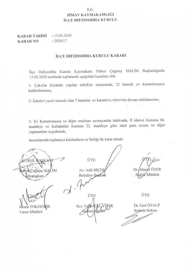 Simav İlçe Hıfzıssıhha Kurulu’nun 15 Mayıs 2020 tarihinde Kaymakam Türker Çağatay Halim Başkanlığında yapılan toplantısında, Çakırlar köyünde yapılan tetkikler sonucunda 22 hanede ev karantinasının kaldırılmasına karar verildi.