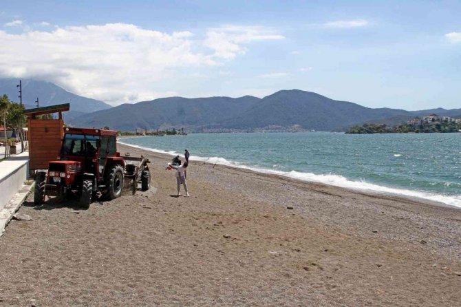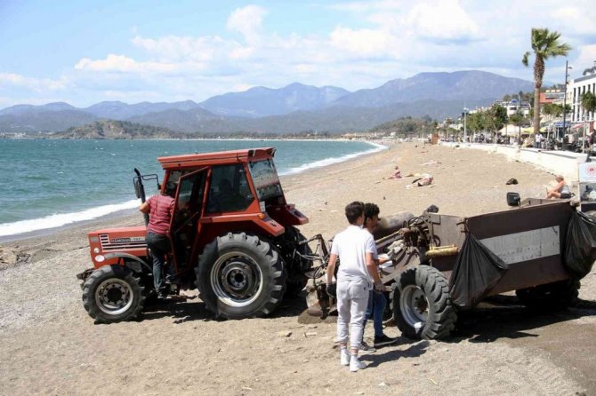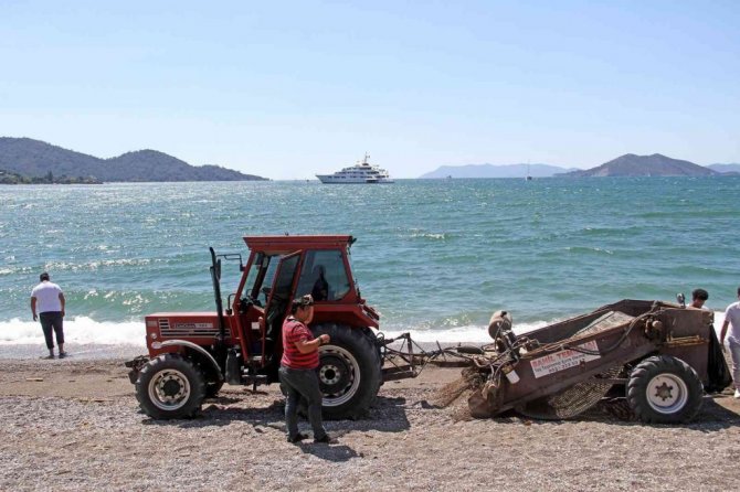 Muğla'nın Fethiye ilçesinde caretta caretta üreme alanı olan Çalış Plajı, traktöre bağlanan kum eleme aracıyla temizlenerek turizm sezonuna hazırlanıyor.