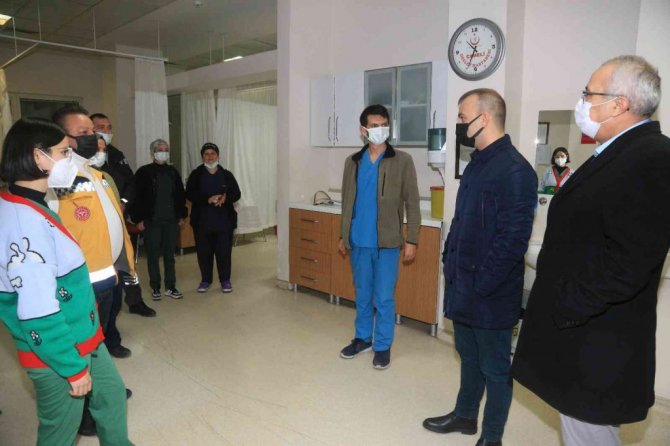 Kaymakam Yenigün ve Başkan Arslan, yeni yıla saatler kala devlet hastanesi 112 sağlık acil çalışanlarına, itfaiye, polis ve askeri personele yılbaşı ziyaretinde bulundu.