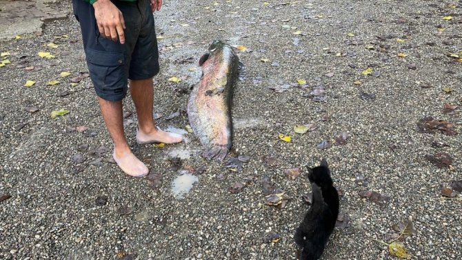 Balığı sosyal medyada görerek fotoğraf çekilmeye gelen vatandaşlar fotoğraf çekilirken, bölgede bulunan kedilerin ise balığa yaklaşmaya çalışması dikkatlerden kaçmadı.