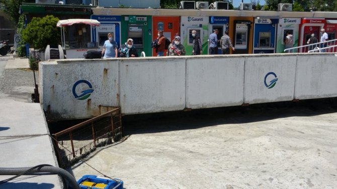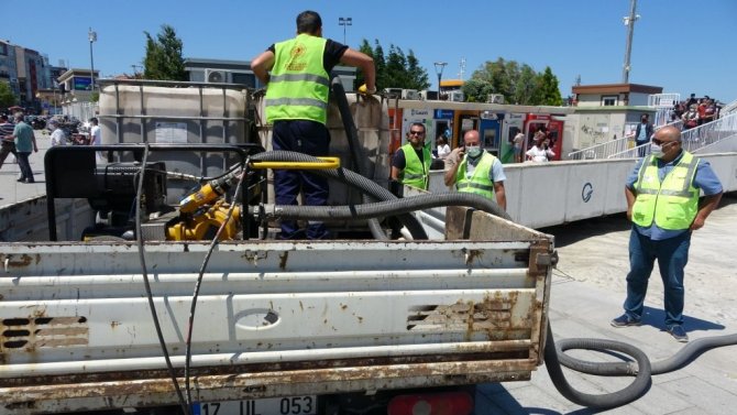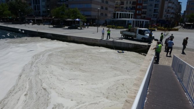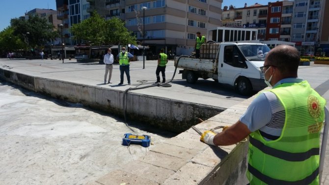 Çevre ve Şehircilik İl Müdürlüğü'nce kordon boyu İskele Meydanı köşesinde şiddetli poyrazla birlikte biriken salyalar, su pompaları ile yüzeyden temizleniyor.