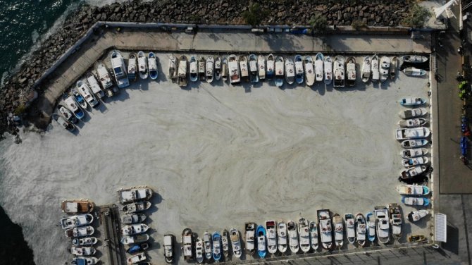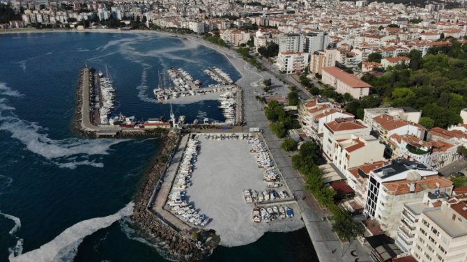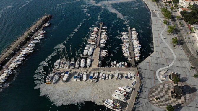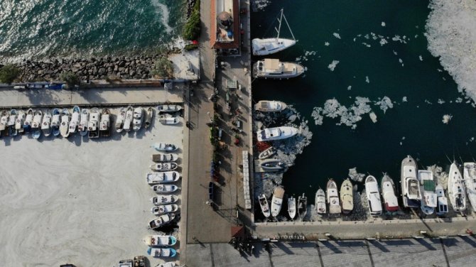 Yat Limanı ve feribot iskelesinde çoğalan müsilaj, geçtiğimiz haftalarda lodos nedeniyle Sarıçay'ın içerisine de dolmuştu.