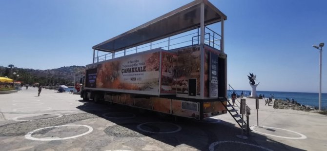 Aydın'ın Kuşadası ilçesi Kültür ve Turizm Bakanlığı tarafından hayata geçirilen "Gezgin Kültür Festivali" kapsamında Türkiye turuna çıkan Çanakkale Mobil Müze Tırı'na ev sahipliği yapıyor. İsmail Cem Dostluk ve Barış Meydanı'nda ziyarete açılan tırın içerisinde Çanakkale Savaşları'nda yaşananları bugüne aktaran savaş materyalleri, videolar, savaş objeleri ve o döneme ait açıklayıcı bilgi ve belgeler sergileniyor. Vatandaşlardan yoğun ilgi gören mobil müze tırı 30 Haziran'a kadar 10.00 - 18.00 saatleri arasında ücretsiz olarak ziyaret edilebilecek.