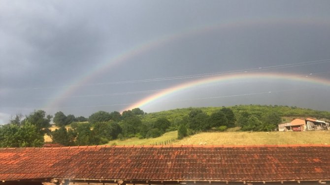 Çanakkale'nin Çan ilçesine bağlı Küçükpaşa köyü ile Hurma köyü arasındaki ormanlık alan üzerinde oluşan muhteşem çifte gökkuşağı manzarası görenleri büyüledi.