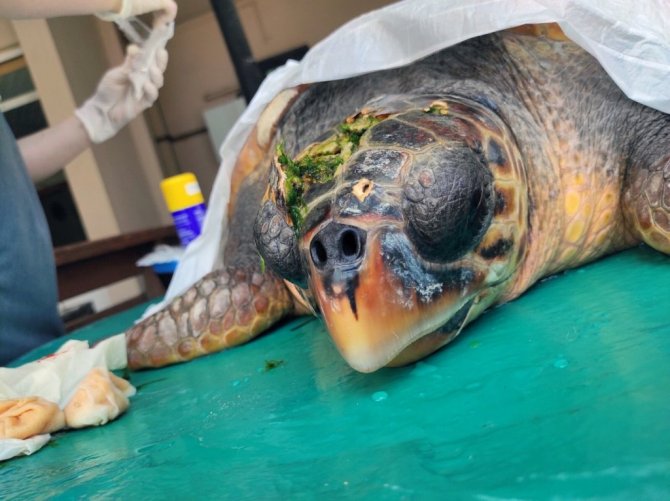 Kafa travması bulunan ergin dişi İribaş deniz kaplumbağası (Caretta caretta) ilk müdahalesinin ardından yoğun bakıma alındı ve gözlem altında tutulduğu açıklandı.