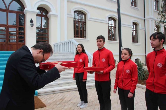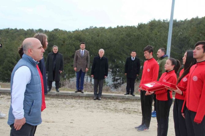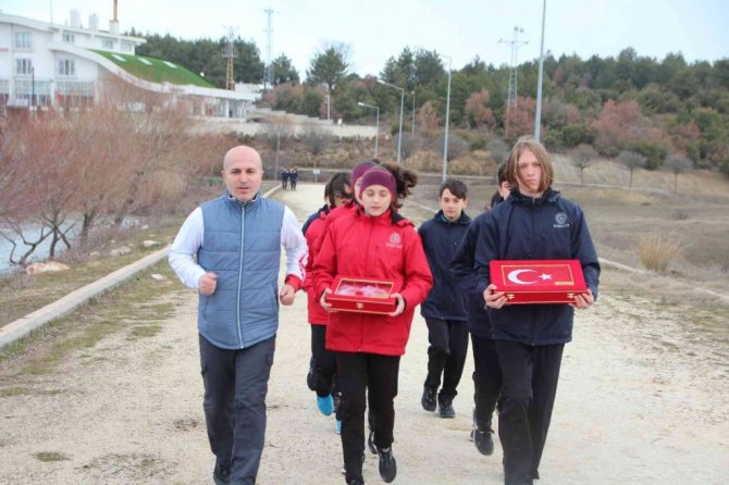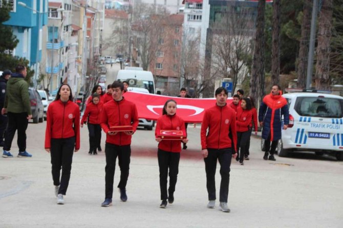 Çanakkale Deniz Zaferi'nin 107'inci yıldönümü dolayısıyla Cumhurbaşkanı Recep Tayyip Erdoğan'a teslim edilmek üzere önceki gün Gelibolu Yarımadası'nda 253 bin şehidin bulunduğu bölgeden alınan toprak, deniz suyu ve Türk Bayrağı'ndan oluşan kutsal emanetler, Bilecikli atletlere teslim edildi.