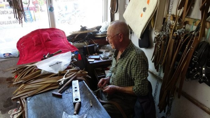 Saraçın at arabası koşumları, binek veya çeki at takımları, eyer, semer gibi bütün takımların deri ve meşinden olan kısımlarını yapan veya tamir eden kişiler olduğunu söyleyen Şahin, "Şimdi Çanakkale merkezden gelerek köpek kayışı yaptırdılar. Gençlik de bu işleri bilmez. Biz aynı tempoda çalışmaya devam ediyoruz. Allah'ımıza şükür sağlığımız yerinde. Sağlığımı da bu meslek ve dükkana bağlıyorum. Kemeri çabuk yaparız, uzun uzadıya bir iş çıkmaz ama hamut vardır, onu da sabahtan öğlene kadar anca yaparız. Hamut atları arabaya koşarken boyunlarından geçirilen deri kaplı halka. Bunlar artık bitti. Şimdi koyun ve köpek kayışları yapıyoruz. Bunlar satılıyor. Hamut ve yular artık yapılmıyor, köylerde bitmiş yani bu işler" diye konuştu.