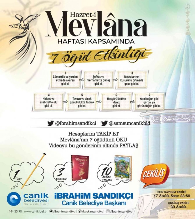 7 ve 17 Aralık tarihleri arasında kutlanan Mevlânâ Haftası kapsamında Canik Belediyesi, ilçede ödüllü anma etkinlikleri düzenliyor. Etkinlikte "Mevlânâ'nın 7 Öğüdü"nü okuyan vatandaşlara çekilişle hediye veriliyor. Çekilişe katılacak olan vatandaşların "Mevlânâ'nın 7 Öğüdü"nü okuyup videoya kaydederek Canik Belediyesi'ne ait sosyal medya hesaplarına göndermeleri isteniyor. Video gönderen katılımcılar arasında yapılacak çekilişte 1 adet Ney, 3 adet Mesnevî-i Şerif ve 10 adet Ahşap Yazboz hediye edileceği duyuruldu. Etkinliğe Canik Belediyesi sosyal medya hesapları üzerinden her yaştan vatandaşın katılabileceği bildirildi.