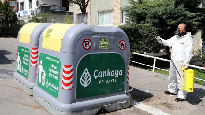 Yerleşik nüfusu 900 bini aşkın, gündüz nüfusu ise 2 buçuk milyonu bulan ilçe sınırlarında temizlik ve ilaçlama yapan Çankaya Belediyesi, evsel atıkların toplandığı konteynerleri önce yıkıyor ardından uçkun mücadelesi için ilaçlamasını yapıyor.