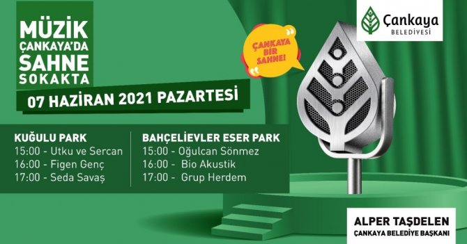 Pandemi nedeniyle geçen yıldan bu yana çalışamayan tiyatrolara, müzik emekçilerine destek veren Çankaya Belediyesi yeni bir etkinlikle müzisyenlere desteğini sürdürüyor. "Çankaya Bir Sahne" etkinliğine katılmak isteyen müzisyenlere kısa süre önce çağrıda bulunan ve 138 müzisyene sahnesini açan Çankaya Belediyesi, ilk etkinliklere 7 Haziran'da başlıyor. İlk gün etkinlikleri Kuğulu Park ve Bahçelievler Eser Park'ta saat 15.00 itibariyle başlayacak.