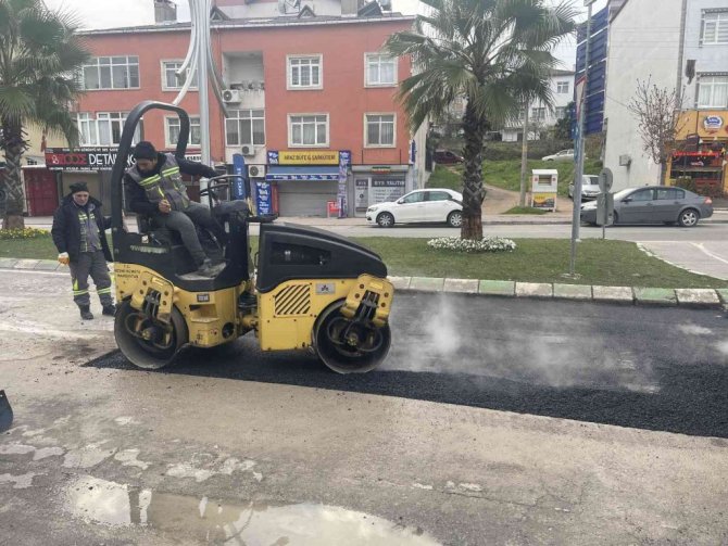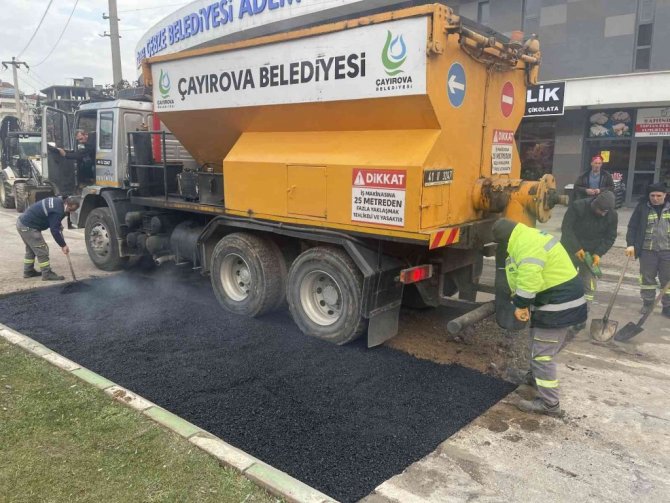 Çayırova Belediyesi Fen İşleri Müdürlüğü ekipleri, Çayırova Mahallesinde bozulan yollarda asfalt yama çalışması gerçekleştiriyor.