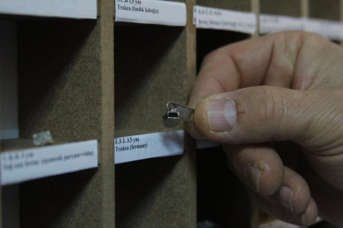 Panoda sergilediği cisimlerden örnekler gösteren Melikoğlu, "Panoda ilgi çeken iki mıknatıs var. Çocuğa oynasın diye verilmiş. 7 yaşındaki çocuk merak etmiş bu mıknatısın birini yutmuş daha sonra bunun ikinci eşini de yutmuş. Bu mıknatıslar bağırsağa kadar gidip orada birleşmişlerdi. Bu kadar sıkışınca bağırsak etkileniyor ve tıkanıyor. Ameliyatla çıkardık ve bağırsağı da onardık. Kalemtıraş çıkardık, paralar var bol miktarda. Çivi ve büyük iğne var. Topuzlu iğneler var, bunu daha çok başörtüsü kullananlarda görüyoruz. Nazarlıklı çatal iğneleri çocuklar yutuyor. Yemek borusunda bu iğne takılıyor. İçeride sıkılır ve devamlı orada kalırsa yemek borusunun delinmesine neden oluyor. Bunları ışıklı boruyla ameliyat ortamında çıkarıyoruz" ifadelerine yer verdi.
