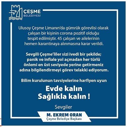 Çeşme Ulusoy Limanı’nda çalışan 1 kişide koronavirüs testi pozitif çıktı. Pozitif çıkan vaka dolayısıyla Çeşme Gümrük Müdürlüğünde çalışanlar ve aileleri evlerinde karantina alındı. Çeşme Belediye Başkanı Ekrem Oran, sosyal medya hesabından yaptığı açıklamada, "Ulusoy Çeşme Limanı’nda Gümrük görevlisi olarak çalışan bir kişinin korona pozitif olduğu tespit edilmiştir. 45 çalışan ve ailelerinin hemen karantinaya alınmasına karar verildi. Sevgili Çeşmeliler, sizi ivedi bir şekilde, panik ve infiale yol açmadan, her türlü önlemi en üst seviyede yerine getirmeniz adına bilgilendirmeyi görev telakki ediyorum. Bilim Kurulunun tavsiyelerine harfiyen uyun. Evde kalın. Sağlıkla kalın" ifadelerine yer verdi.