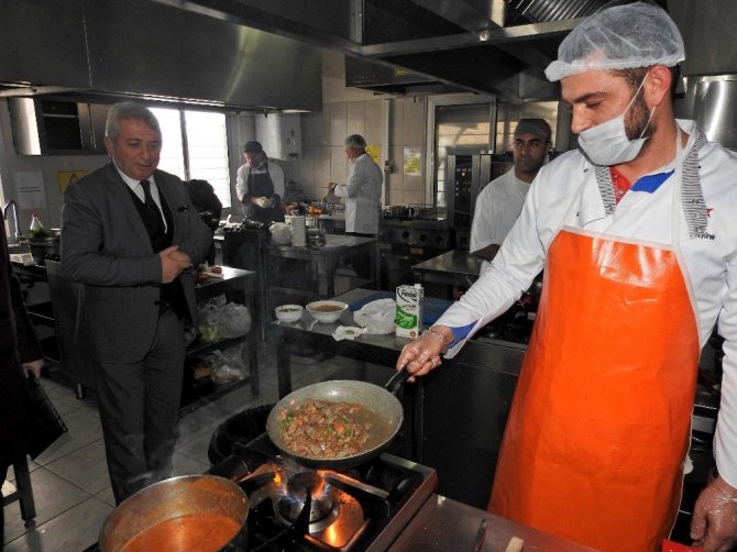Yahya Kerim Onart Mesleki ve Teknik Anadolu Lisesi’nin mutfak atölyesinde gerçekleştirilen uygulamalı sınavı, Çeşme Milli Eğitim Müdürü Şahan Çoker de izledi.