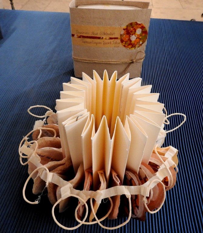"Sanatçı kitapları; çizim, boyama, kolaj asamblaj gibi türlü tekniklerinin bir arada yer aldığı bir sanatsal üretim şekli. Bizler kardeş dernekler; Ankara merkezli Kağıt Sanatçıları Derneği (KSD) ve Kıbrıs Kağıt Sanatçıları Derneği (KKSD) olarak pandemi sürecinde ortak bir proje yürüttük. Karşılıklı iki sanatçı üye, yaptığı el eseri kitabı bir diğerine postaladı. Ardından diğer sanatçı eklemeler yaparak kitabı tamamladı. Dolayısıyla her kitap iki sanatçının eseridir. Bu eklemeler sayfa ekleme eksiltme üzerine boyama gibi türlü müdahalelerle değiştirildi, geliştirildi. Sanatçılar birilerine karşı bu sayede toleranslı olmayı da gösterdiler ve örnek oldular. Bu yönüyle sevginin serginin eğitsel bir yönü var. Sanatçı eşleştirmeleri rastgele; yaş, eğitim derecesi, akademik unvan gözetilmeden yapıldı. Eserlerde, atık kağıtların öğütülmesi suretiyle yeni bir form ve renkte dönüştürülen el yapımı kağıtlar kullanıldığı kadar endüstriyel, sanatsal kağıtlar da kullanıldı. Serginin bu yönüyle çevreci bir yaklaşımı da var. Eserlerin bütününe bakıldığında çok çeşitli zenginlikte malzeme kullanımı göze çarpmaktadır. Eserlerin bazıları öyküsel anlatımlar içerse de, bazıları tamamen sanatçıların tarz ve ustalığının bir gösterisi olarak tasarlanmışlardır."