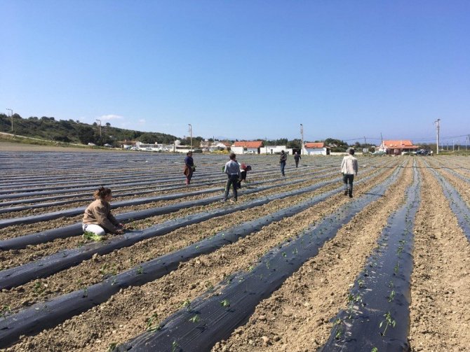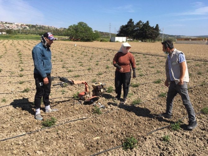 Korona virüsü salgını ile mücadelesi kapsamında ilan edilen 4 günlük sokağa çıkma kısıtlamasından muaf tutulan Çeşmeli çiftçiler, tarlalarında üretime devam etti.