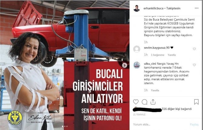 Buca Belediyesi ev sahipliğinde KOSGEB’in ‘Uygulamalı Girişimcilik Eğitimleri’ne katılarak geçen yıl kendi otomobil tamir atölyesini kuran Nergiz Yavaş, genellikle "erkek işi" olarak görülen bu sektöre girerek pek çok kadına da ilham oldu. Bu işin "çocukluk hayali" olduğunu belirten Yavaş’a sosyal medyada da pek çok kadın destek oldu.