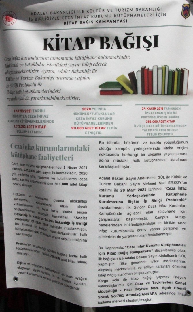 Adalet Bakanlığı ile Kültür ve Turizm Bakanlığı arasında Mart ayında Türkiye genelindeki Ceza İnfaz Kurumlarında kütüphane kurulmasına yönelik işbirliği protokolü imzalandı. İki bakanlık arasında 2019 yılında da kitap bağış kampanyası başlatılmış ve bu kampanya sonunda ceza infaz kurumlarının kütüphanelerinde 1 Mayıs 2021 tarihi itibari ile 1 milyon 12 bin adet kitap bulunduğu açıklandı.