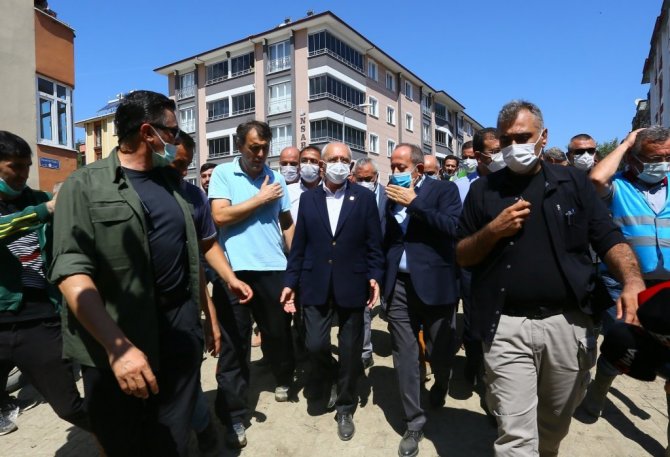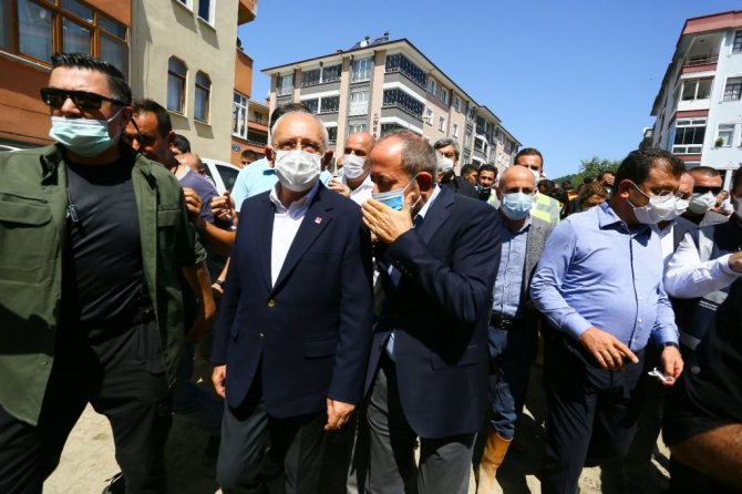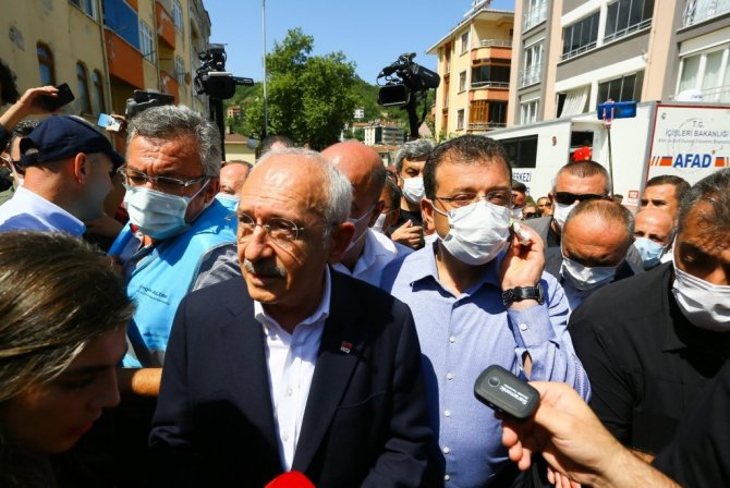 Cumhuriyet Halk Partisi (CHP) Genel Başkanı Kemal Kılıçdaroğlu, sel felaketinin yaşandığı Kastamonu'nun Bozkurt ilçesinde incelemelerde bulundu. İstanbul Büyükşehir Belediye Başkanı Ekrem İmamoğlu ile incelemelerde bulunan Kılıçdaroğlu, İçişleri Bakanı Süleyman Soylu'dan da bilgi aldı. Afet bölgesinde incelemelerde bulunduktan sonra bir açıklama yapan CHP Genel Başkanı Kemal Kılıçdaroğlu, "Sel felaketinin en büyük tahribatı açtığı Bozkurt'tayız. İçişleri Bakanı ile görüştük kendisi de bazı bilgiler verdi. Kendilerine ihbar olarak gelen kayıplar var. Son rakam konusunda biz zamanı geldiğinde veriler elimize ulaştığında kamuoyunu bilgilendiriyoruz diye söylediler. Belediye Başkanı ile de görüştük. Bozkurt Belediye Başkanlığına elimizden gelen her türlü yardımı yaptığımız bir talepleri olduğunda da bu taleplerini süratle karşılayacağımızı, Belediye Başkanlarımızın burada olduğunu ve özellikle İstanbul Büyükşehir Belediye Başkanı son girdiğimiz sokağı tamamı ile teslim aldı. Orayı bir şekilde kullanılabilir hale getireceğini söyledi Ekrem Bey. Değerli arkadaşlar felaketten sonra önlem almak hepimizin görevi. Önemli olan felaketin geleceğini bilerek önlem almaktır. 2019 yılında bu bölge için taşkın sel raporu hazırlanmış. 2019'da bu bölgede ciddi taşkının geleceğinin bilindiği halde ciddi bir önlem alınmaması devletin iyi yönetilmediği anlamına gelir. Ben Belediye Başkanına da ilettim dere yatağında yapılaşmaya izin vermemek lazım. Dere kenarına yapılaşmaya izin verirseniz, az önce ifade ettiler 8 katlı bir bina çökmüş, onu yanında bir yurt binası var o çökmüş, onun yanında bir bina daha var onlar hasar görmüş. Bu selin geldiği belli, bu yağmurun geldiği belli. Yüz yıllardır bütün Karadeniz bunu yaşıyor. Peki nasıl olurda bu gerçekler bilindiği halde dere kenarlarına yapılaşma izni verilir? Bu çok acı bir şey bundan ders çıkarmalıyız" ifadelerini kullandı.