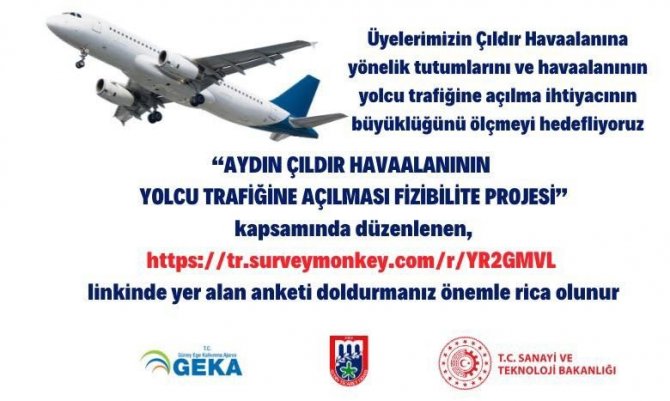 Konu ile ilgili AYTO tarafından yapılan açıklamada, "Güney Ege Kalkınma Ajansı desteğiyle Odamız tarafından başlatılan "Aydın Çıldır Havaalanının Yolcu Trafiğine Açılması Fizibilite Projesi" kapsamında üyelerimizin Çıldır Havaalanı'na yönelik tutumlarını ve havaalanının yolcu trafiğine açılma ihtiyacının büyüklüğünü ölçmeyi hedefliyoruz. Bu bağlamda https://tr.surveymonkey.com/r/YR2GMVL linkinde yer alan anketi doldurmanız önem arz etmektedir" ifadelerine yer verildi.