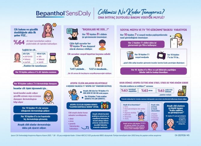 Bepanthol SensiDaily için yapılan "Türkiye Cilt Farkındalığı Araştırması'na göre, cilt denildiğinde 10 kişiden 6'sının aklına ilk gelen yüz bölgesi oluyor; insanlar sağlıklı bir cildin göstergesinin de yüz olduğunu söylüyor. Cilt bakımı kozmetik bir ihtiyaç gibi algılanırken her 10 kişiden yalnızca 4'ü vücudunu nemlendirdiğini ifade ediyor. Araştırmaya göre her 10 kişiden 6'sı cilt tipini kendi gözlemiyle belirliyor ve her 10 kişiden yalnızca 2'si cilt tipini öğrenmek için dermatoloğa danışıyor. Her 4 kişiden 3'ü "atopik cilt" kavramını daha önce duymadığını söylüyor. Araştırmaya göre, vücut bölgesinde kuruluk ve buna bağlı kaşıntı ön plana çıkıyor olmasına rağmen, cildini çok kuru veya atopik olarak tanımlayanların oranı ise yalnızca yüzde 6. Bu durum "atopik cilt" olduğunun farkında olmadan hayatlarına devam eden insanlar olduğunu gösteriyor. Araştırma, yaşanılan cilt sorunlarının her 10 kişiden 9'unu duygusal olarak olumsuz etkilediğini hatta yaklaşık yarısında sosyalleşmelerinin de önüne geçtiğini gösteriyor. Buna rağmen, Türkiye'de insanların cilt tipleri ve cilt bakımı konusunda farkındalıklarının düşük olduğunu gözler önüne seriyor. Özellikle atopik veya çok kuru cilde sahip bireyler, cilt tiplerine bağlı fiziksel sorunlar sebebiyle stres, sinir, endişe, özgüvensizlik gibi duygular yaşıyor ve yüzde 74'ü yaşadıkları kuruluğa bağlı kaşıntı ve kuruluk ataklarının hayat ve uyku kalitelerini yoğun bir şekilde etkilediğini söylüyor. Toplumda atopik ve çok kuru cilt tipi ve bu cilt tipinin ihtiyaçları konusunda farkındalık da düşük.