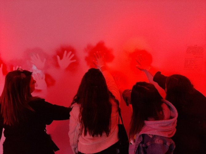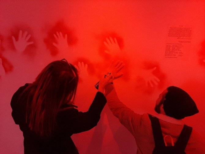 Galeri mekânında kadına dair hiç bir görselin bulunmadığını belirten Dr. Öğretim Üyesi Özlem Vargün, iç mekanda kullanılan kırmızı renk ve diğer ses ve temaların ne anlama geldiğini şöyle anlattı: “Sergideki renkler, sesler ve diğer temalar kadın cinayetlerini anlatıyor. Sergi; site-specific (ortam odaklı) bir yerleştirmeyle oluşturulmuştur. Mekanın atmosferine hakim olan kırmızı renk, kalp atışı sesi ve sayaç sesi tekinsizliği, yazılar merakı, giriş kapısı ise gerilimi simgelemektedir. Sergi bütünsel bakış açısıyla farkındalık oluşturmakta ve bilindik baskın hegemonyanın içinde kalan kadının duygu durumunu sorgulamaktadır. Katılımcıların duvarlara bıraktığı izler ise mağara resimleri gibi geleceğe bırakılan mesajlardır. Birlik, destek ve farkındalık anlamına gelmektedir.”