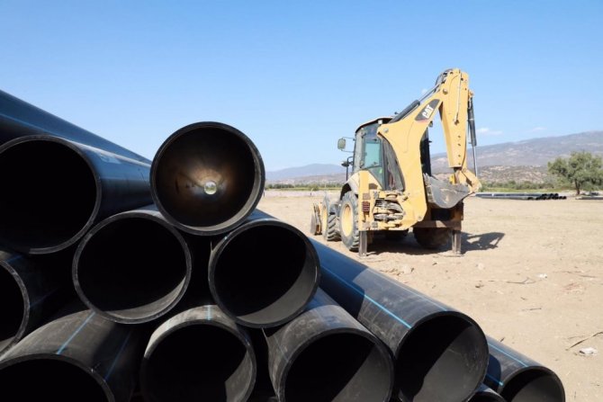 Devlet Su İşleri 21. Bölge Müdürü Emrah Köleoğlu, Bölge Müdür Yardımcısı İnan Gündüz ve ilgili şube müdürlerinden oluşan heyet, Çine Ovası'nı modern borulu sistem ile sulama imkanı sağlayacak olan Aydın Çine Sulaması 2. Kısım inşaatının koordine edildiği şantiye sahasını ziyaret ederek, yüklenici firma yetkililerinden bilgi aldı. Geçtiğimiz günlerde sözleşmesi imzalanan ve şantiye kurulum çalışmalarına başlanan Çine Sulaması 2. Kısım çalışmalarında ilk borular şantiye sahasına indi. Projenin nihayete ermesiyle, Çine Ovası'nda bulunan 66 bin 800 dekar zirai arazinin modern borulu sistem ile sulanması sağlanacak.