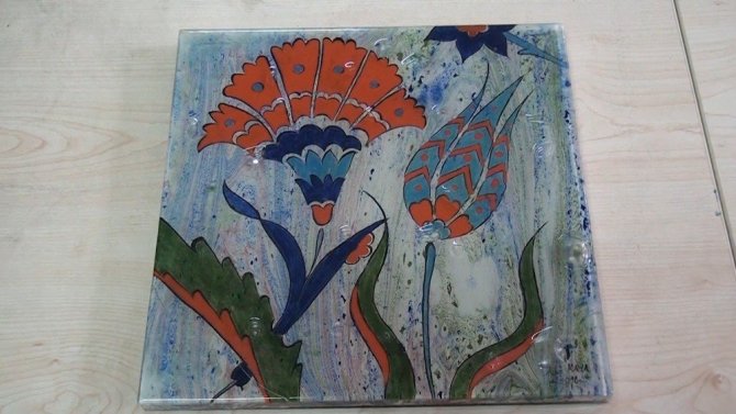 Çininin yıllar içerisinde deforme olduğunu ve çatladığını, ömrünü daha da uzatabilmek amacı ile böyle bir çalışma başlattıklarını söyleyen Seramik ve Cam Teknolojileri Alan Şefi Sema Aslan Öztürk, “Cam füzyon çalışması genellikle cam tabakların üretiminden kalıpların üzerine camın yerleştirilmesi ile füzyon fırınların fırınlanması sonucu ortaya çıkmaktadır. Biz bunu çiniye uygulamak istedik. Çininin aşamaları sonucunda deseni basıp, tahrirleyip boyadıktan sonra bu sanatı uzun yıllar dayanıklı olsun, dış yapıya uygun olsun, havuzlarda ve dış cephe kaplamalarında kullanalım diye belirli derecede cam füzyon uyguladık. Karolarda, genellikle düz zeminlerde yaklaşık 10 yıl önce bulunan bir teknik sonucunda çalışmalarımızı yoğunlaştırdık. Son yıllarda ise sergiler sonucunda 1-2 senedir piyasada aktif olarak kullanılmaktadır. Biliyorsunuz ki çini çalışmaları çok sıcak ve soğuklarda derece farklarından dolayı büyük ölçüde deforme oluyor, çatlamalar oluyor. Ama bu çalışmayı uyguladığımızda bu çalışma ile yüz yıldan fazla ömre sahip olacak” dedi.