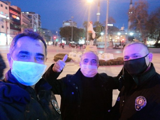 Montunu çıkarıp üzerini örten polisi yanağından öpen çıplak vatandaş, ekiple birlikte özçekim yapmayı da ihmal etmedi.
