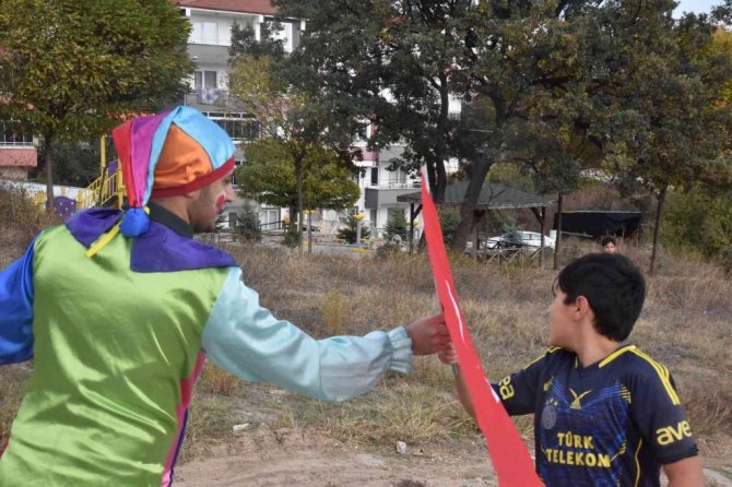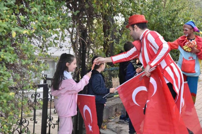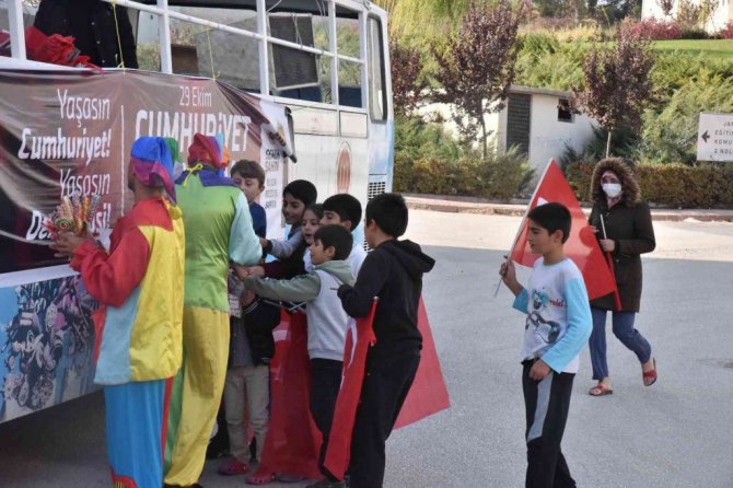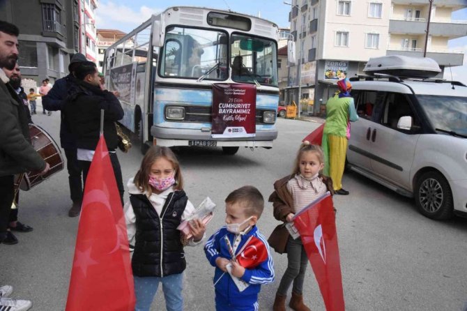 Bilecik Belediyesi tarafından gerçekleştirilen 29 Ekim Cumhuriyet Bayramı etkinlikleri kapsamında çizgi film karakterlerinin kostümlerini giyen animasyoncular üstü açık otobüs ile sokak sokak gezip, çocuklara şeker, maske ve bayrak dağıttı.