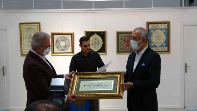 Açıklama sonrası kurdele kesilerek Diyarbakırlı Hattat Mehmet Han Akan, Vali Münir Karaloğlu'na çizdiği hatlardan birini hediye etti.