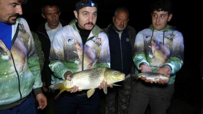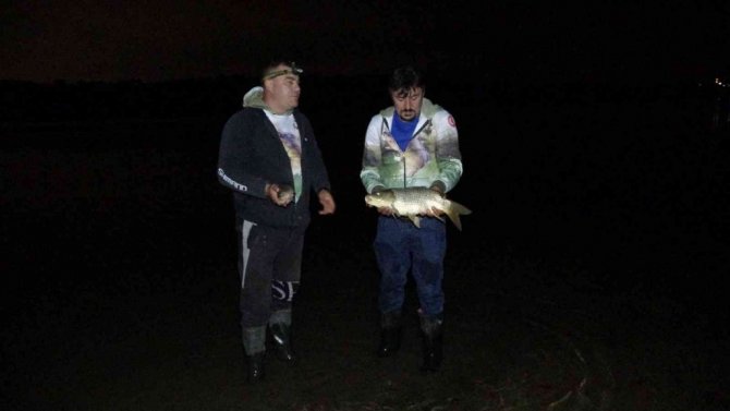 Çökertme havuzlarımızda su seviyesinin düşmesiyle beraber gölde yumurta bırakan anaç balıklarımızın burada mahsur kaldı. Bu anaç balıklarımızı buradan kurtarıp barajımızın ana gövdesine salma marifetiyle bunu yapıyoruz. Bu işi gece yapmamızın sebebi, bütün arkadaşlarımız işinde, gücünde, kimi esnaf, kimisi memur arkadaşlar. Ondan dolayı bu saatlerde anca müsait olabildik. Burada ilgili kurumlara bilgi vererek burada mahsur kalan balıklarımızı kurtarıyoruz.