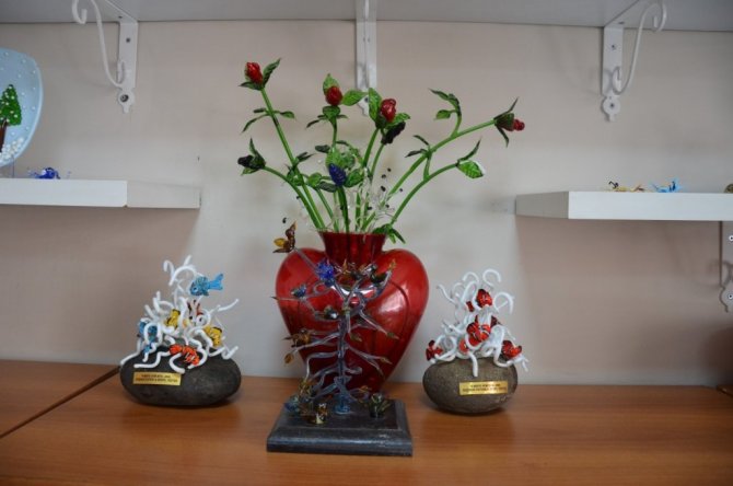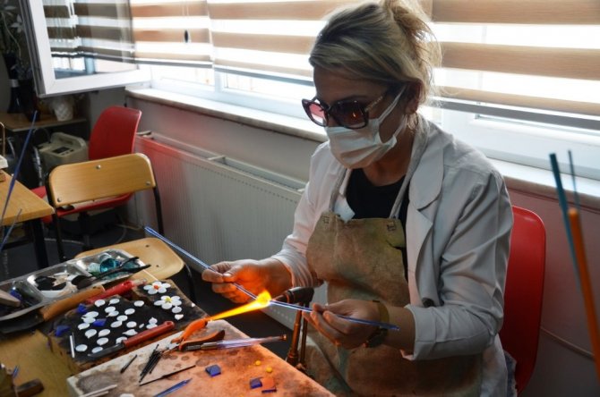 Usta Öğretici Ayşenur Öztürk, "Cam sanatı sıcak cam şekillendirme kursu veriyorum. Osmanlı döneminden bu zamana gelmiş unutulmaya yüz tutmuş el sanatı olarak geçiyor. Doğaya katkımızda oluyor. Doğada 3 buçuk yılda erimeyen cam atıklarımızı biz burada ateş de şalama da eriterek ev hanımlarıyla beraber şekil veriyoruz. Önce kursiyerlerimize camı tanıtıyoruz. Camın erime seviyesini, nasıl eritmesi gerektiğini, şalamayı tanıtıyoruz. Ateşi nasıl kullanacağını öğretiyoruz. Çünkü ateşi 800 ila 1000 - 2000 bin derece arasında ateş değişiyor. Cam atıklarımızı burada eriterek şekil veriyoruz. Kesinlikle kalıp kullanmıyoruz. Kendine özgü figürler ortaya çıkıyor. Birinin yaptığı ötekine asla benzemiyor. Parmak izi gibi düşünün. Herkesin parmak izi ayrı, o şekilde camı ateşte dans ettiriyoruz, çöpten de vitrine taşıyoruz" dedi.