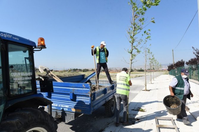 Çorum Belediyesi kent merkezinde, bir yandan yeşil dokuyu güzelleştirirken bir yandan da yeni ağaçları toprakla buluşturmaya devam ediyor.