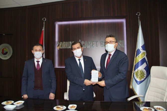 Hitit Üniversitesi Erol Olçok Eğitim ve Araştırma Hastanesi Başhekimi Prof. Dr. Mesut Sezikli, hastane yöneticileriyle birlikte Ticaret Borsası'nı ziyaret ederek pandemi döneminde cihaz bağışıyla mücadeleye destek olan Ticaret Borsası yöneticilerine teşekkür ederek plaket takdim etti.