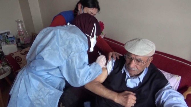 Iğdır İl Sağlık Müdürlüğüne bağlı ekipler Topçular Mahallesinde ikamet eden 89 yaşındaki Selahattin Ünsal'ın evine giderek korona virüs aşısını yaptı.