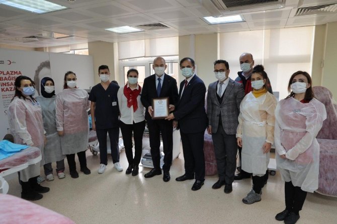 Bakan Soylu'ya plazma bağışçılarına verilen İmmün Plazma Bağış Beratı da takdim edildi.
