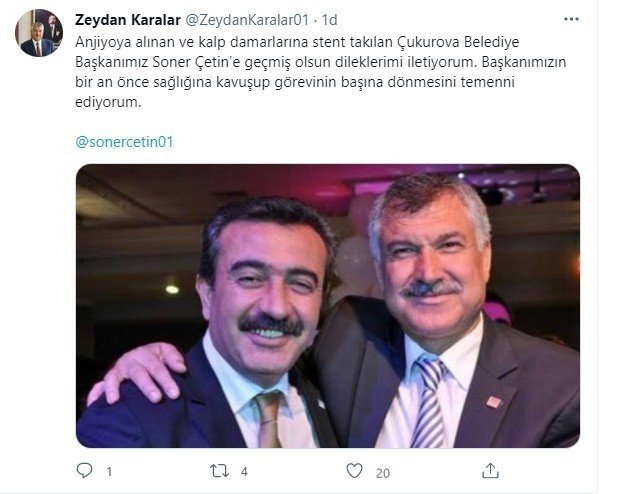 "Anjiyoya alınan ve kalp damarlarına stent takılan Çukurova Belediye Başkanımız Soner Çetin'e geçmiş olsun dileklerimi iletiyorum. Başkanımızın bir an önce sağlığına kavuşup görevinin başına dönmesini temenni ediyorum."