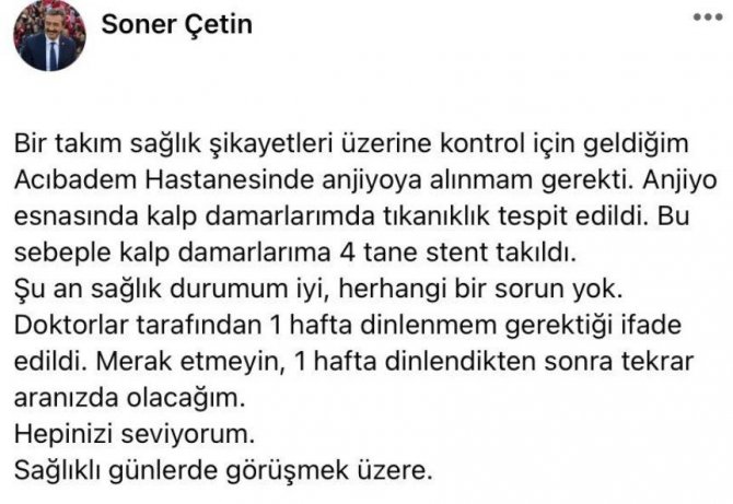 Sosyal medyada yaptığı paylaşımda Başkan Çetin, "Bir takım sağlık şikayetleri üzerine kontrol için geldiğim Acıbadem Hastanesinde anjiyoya alınmam gerekti. Anjiyo esnasında kalp damarlarımda tıkanıklık tespit edildi. Bu sebeple kalp damarlarıma 4 tane stent takıldı. Şu an sağlık durumum iyi, herhangi bir sorun yok. Doktorlar tarafından 1 hafta dinlenmem gerektiği ifade edildi. Merak etmeyin, 1 hafta dinlendikten sonra tekrar aranızda olacağım. Hepinizi seviyorum. Sağlıklı günlerde görüşmek üzere" ifadelerini kullandı.