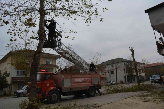DÜZCE(İHA) – Cumayeri Belediyesine bağlı ekipler, yıl boyunca sürdürdükleri çalışmalarını, yaklaşan kış mevsimi öncesinde ilçenin her bölgesinde yoğun şekilde sürdürüyor. Bir yandan yapraklar temizlenirken bir yandan da ağaçlar budanıyor.
