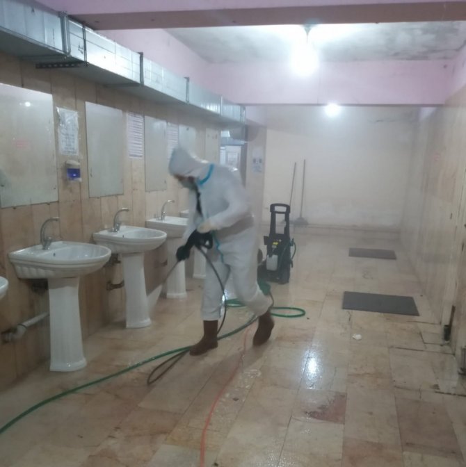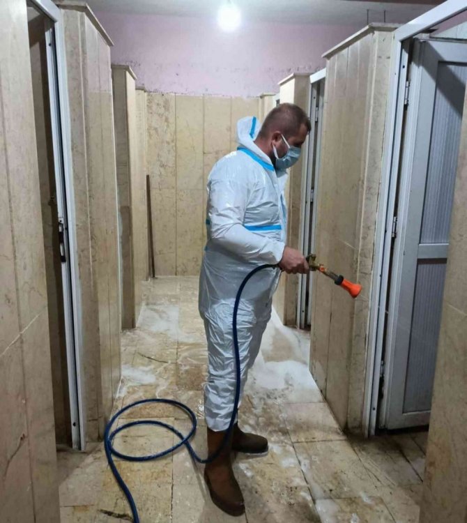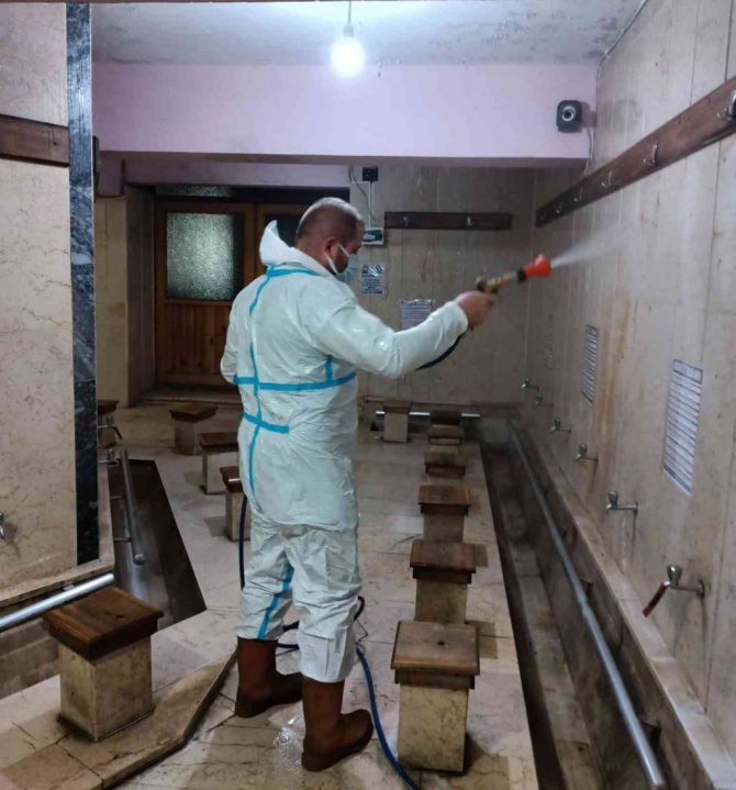 DÜZCE(İHA) – Cumayeri Belediyesi ekipleri kente bulunan camilerin tuvalet ve şadırvanlarında dezenfektanla temizlik çalışması yaptı.
