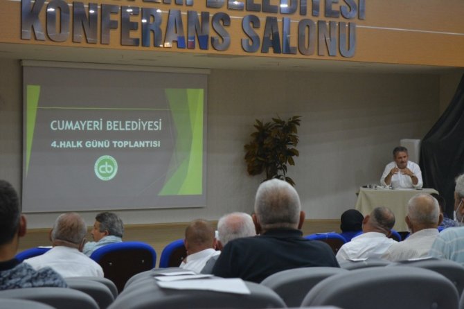 Bu çerçevede düzenlenen Cumayeri Belediyesi toplantı salonunda düzenlenen 4. Halk günü toplantısında da vatandaşlar dinlendi. Cumayeri Belediye Başkanı Mustafa Koloğlu, toplantıların devam edeceğini belirterek "4. Halk Günü toplantımızı gerçekleştirdik. Öncelikle katılım sağlayan vatandaşlarımıza çok teşekkür ediyorum. Halk Günü toplantıları Belediyemiz ile vatandaşlarımız arasında bir köprü oluşturduğunun bilincinde olarak bundan sonraki süreçte de devam edecektir. Yoğun bir tempoda çalışıyoruz. Projelerimiz ile ilgili çalışmaları sosyal medyadan sürekli paylaştığımız için, bu tür toplantılarda hizmetlerin anlatımı kısa kesip vatandaşlarımızın sıkıntılarını veya taleplerini dinlemeyi seçiyoruz. Bu toplantıda da bunu yaptık. Halkımızdan gelen tüm talepleri ilgili birim amirlerimizin de katıldığı toplantıda not aldık. Dediğimiz gibi Cumayeri'ni sizler ile yöneteceğiz" dedi.