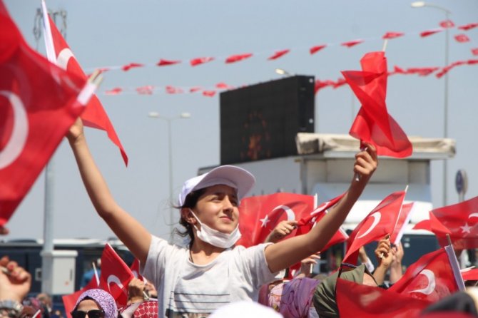 "Sizlerle uzun bir aradan sonra buluştuğumuz bu anlamlı günde en kalbi duygularımla selamlıyorum. Akdeniz'in incisi, tarihin, kültürün şehri Hatay'ın her bir ilçesindeki, mahallesindeki kardeşlerime selam ve sevgilerimi gönderiyorum" diyerek başlayan Erdoğan, "Kardeşlerim, bugün gördüğünüz gibi birçok açılışları yapacağız. Başta Hatay Şehir Stadı'mız olmak üzere barajlarla, birçok spor tesisleriyle inşallah Hatayımızı çok farklı bir hale getirmenin adımlarını atıyoruz. Ben bu arada Türkmeni, Kürdü, Arabıyla Hatayımızın hoşgörü atmosferi içerisinde bulunduğu için sizleri bu anlamda da selamlıyorum. Hep şunu söyledik. Bir olacağız, diri olacağız, kardeş olacağız, hep birlikte Türkiye olacağız, dedik. Bu kardeşliğimiz hamdolsun bizi bugünlere getirdi. Önümüzde daha iyi günler var. Bunu sizlerle gerçekleştireceğiz. Ben sizlere inanıyorum. 2023'e hazır mıyız? 2023 inşallah Hatay'da bir değişim, bir dönüşüm yılı olacak mı? Sizin bu haykırışlarınız bunu gösteriyor.