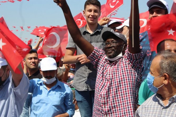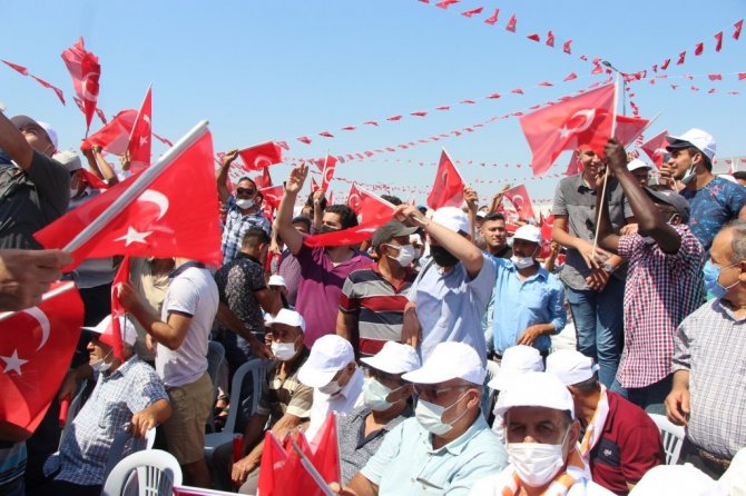Cumhurbaşkanı Recep Tayyip Erdoğan Hatay'da stadyum, BOTAŞ Ertuğrul Gazi Yüzer Depolama ve Gazlaştırma Gemisi, MOBSAN Sanayi Sitesi ve yapımı ile tamamlanan diğer projelerin açılış töreni öncesi Hatay Stadyumu'nun önünde kendisini bekleyen kalabalığa seslendi.