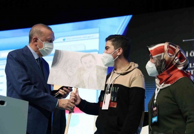 Cumhurbaşkanı Erdoğan açıklamalarının ardından daha sonra kendisi ve annesinin resmedildiği karakalem çalışmasını hediye eden engelli vatandaşı kabul etti.