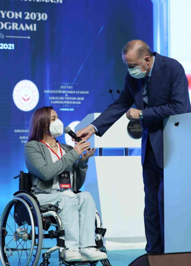 Cumhurbaşkanı Erdoğan, bir süre engelli gençle yakından ilgilendikten sonra butona basarak 750 engelli öğretmenin atamasını gerçekleştirdi.