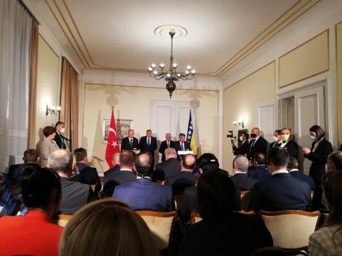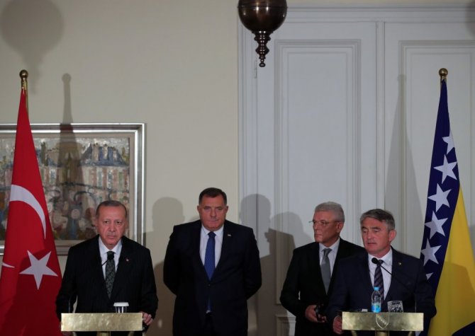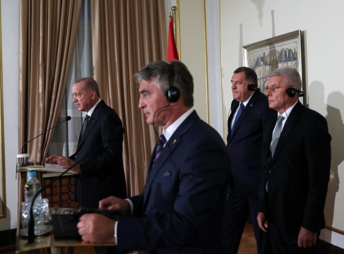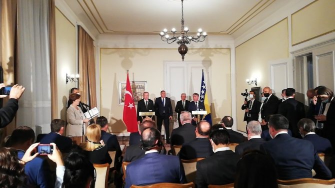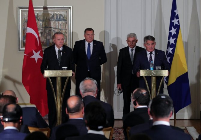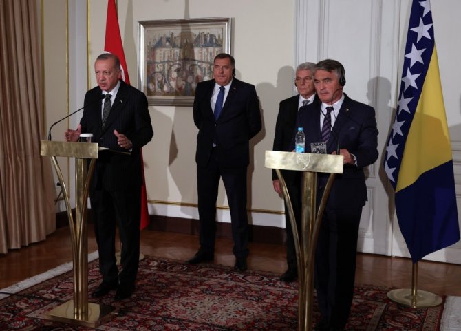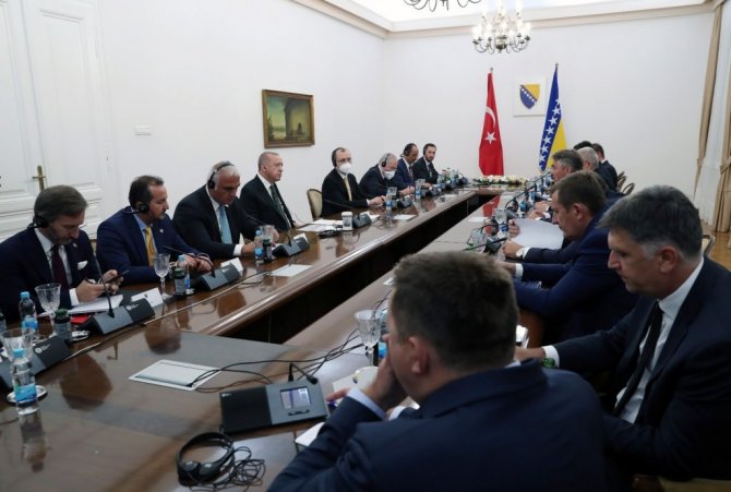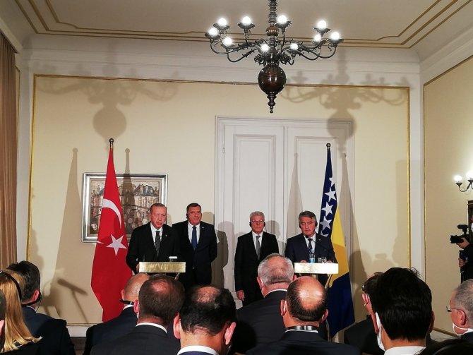 Cumhurbaşkanı Recep Tayyip Erdoğan, Bosna Hersek Devlet Başkanlığı Konseyi'nin daveti üzerine geldiği Bosna Hersek'in başkenti Saraybosna'da Bosna Hersek Devlet Başkanlığı Konseyi Başkanı Zeliko Komşiç ve Konsey üyeleri Şefik Caferoviç ve Milorad Dodik ile gerçekleştirdiği görüşmelerin ardından ortak basın toplantısı düzenledi. Cumhurbaşkanı Erdoğan yaptığı konuşmada, misafirperverlikleri için Bosna Hersek Devlet Başkanlığı Konseyi Başkanı Komşiç ve Konsey üyelerine teşekkür etti. Bosna Hersek Devlet Başkanlığı Konseyi ile yıl içinde 3 kez görüştüklerini belirten Erdoğan, "Temaslarımızdaki bu sıklık, ilişkilerimize ve yakın diyalog içinde bulunmaya verdiğimiz kıymetin somut göstergesidir. Bosna Hersek'in milletimizin gönlünde apayrı bir yeri var. Geçtiğimiz haftalarda karşı karşıya kaldığımız yangın ve sel felaketlerinde Bosna Hersek'ten gönderilen dayanışma mesajları da bunun karşılıklı olduğunun göstergesidir" dedi.